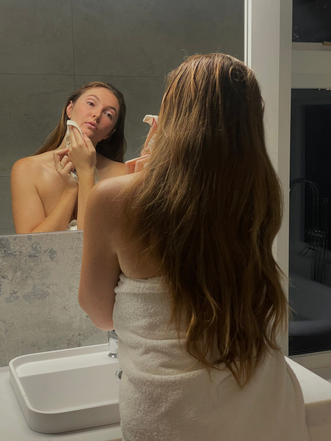 APPLY 5-7 DROPS INTO YOUR PALMS— MASSAGE INTO FACE + NECK USING UPWARD CIRCULAR MOTIONS + RINSE WITH YOUR FACE CLOTH.